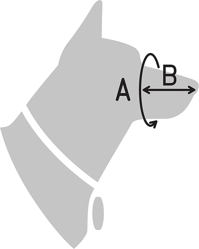 - PLEASE MEASURE: circumference (value A on the second photo) and length (value B on the second photo) of your dog's snout to confirm size. Size M: A is 11". B is 4". Size L: A is 13". B is 4".