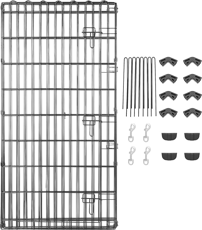 - 8 connected panels with thumb clips for connecting the ends together; 2 locking slide-bolt door latches; 8 ground anchors for secure placement outdoors; made of durable iron wire with a rustproof finish