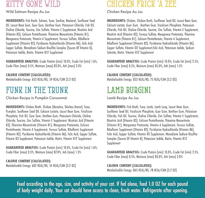- Kitchen Cuties Variety Pack, (10oz Can, Pack of 12) Featuring a variety of wild salmon, cage free chicken and lamb in a delicious Au Jus. An all natural blend of premium proteins that catโs can't resist!