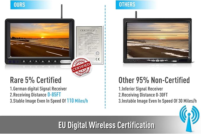 - 🔅【Backup camera No Interference】This reversing system features a 2.4GHz digital wireless transmission that delivers crystal-clear video without interference, even at highway speeds up to 85mph. The advanced signal processing ensures zero lag or signal dropout, providing reliable real-time monitoring for safer driving and reversing maneuvers.
