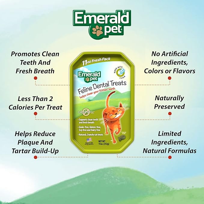 - DELICIOUS AND NUTRITIOUS DENTAL CAT TREATS FOR CLEAN TEETH, FRESH BREATH, AND HEALTHY GUMS — Reward your cat with tasty and crunchy Emerald Pet Feline Dental Treats as a hassle-free and fun way to provide cat dental care. These healthy cat treats contain active dental properties that clean teeth and freshen breath and also fight plaque and tartar buildup. Available in six recipes that cats find irresistible - Chicken, Salmon, Tuna, Ocean Fish, Turducky, and Catnip