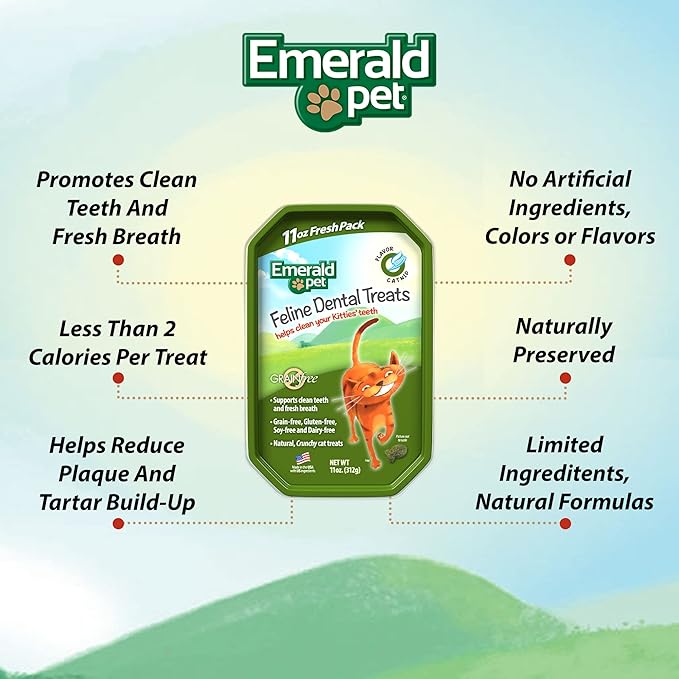 - DELICIOUS AND NUTRITIOUS DENTAL CAT TREATS FOR CLEAN TEETH, FRESH BREATH, AND HEALTHY GUMS — Reward your cat with tasty and crunchy Emerald Pet Feline Dental Treats as a hassle-free and fun way to provide cat dental care. These healthy cat treats contain active dental properties that clean teeth and freshen breath and also fight plaque and tartar buildup. Available in six recipes that cats find irresistible - Chicken, Salmon, Tuna, Ocean Fish, Turducky, and Catnip