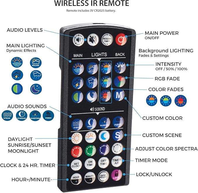 - 24-HOUR WIRELESS TIMER CONTROL - Wirelessly set any color shade or automate your lights on a 24-hour schedule. Program a daily on/off time, gentle sunrise and sunset, bright daylight and soothing moon light. Connect a set of speakers or a background light to experience even more immersive effects.