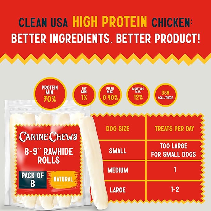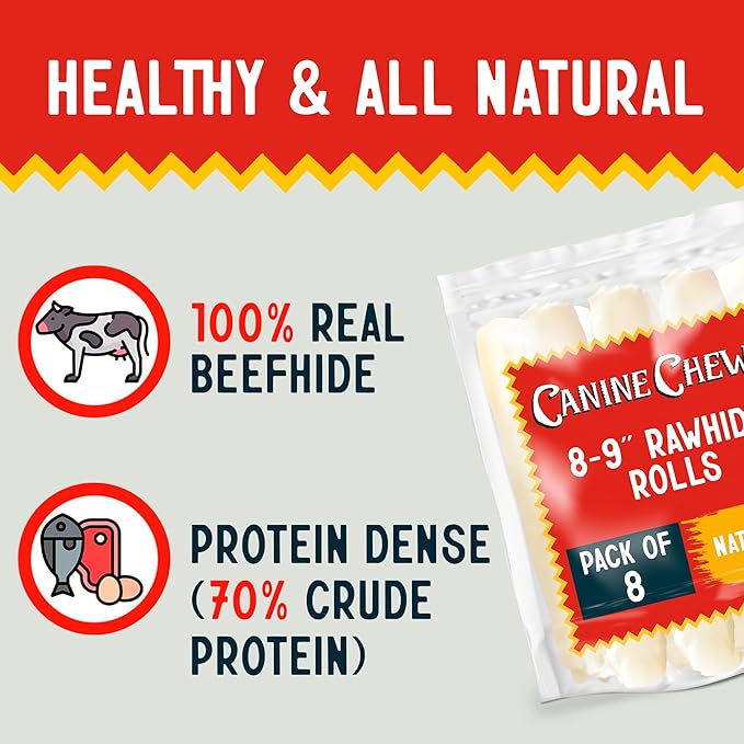 Canine Chews 8-9" Retriever Roll Rawhide Bones for Large Dogs - Durable, Thick Rawhide Bones, Quality Dog Rawhide Chews for Medium to Large Dogs, Thick Size Keeps Dogs Occupied (8 Pack)
