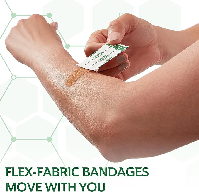 - FIRST-AID KIT ESSENTIALS: Contains alcohol prep pads and Flex-Fabric, plastic, spot and waterproof bandages offers the items necessary to effectively clean, cover, and protect minor injuries—ideal for cuts, scrapes, and burns.