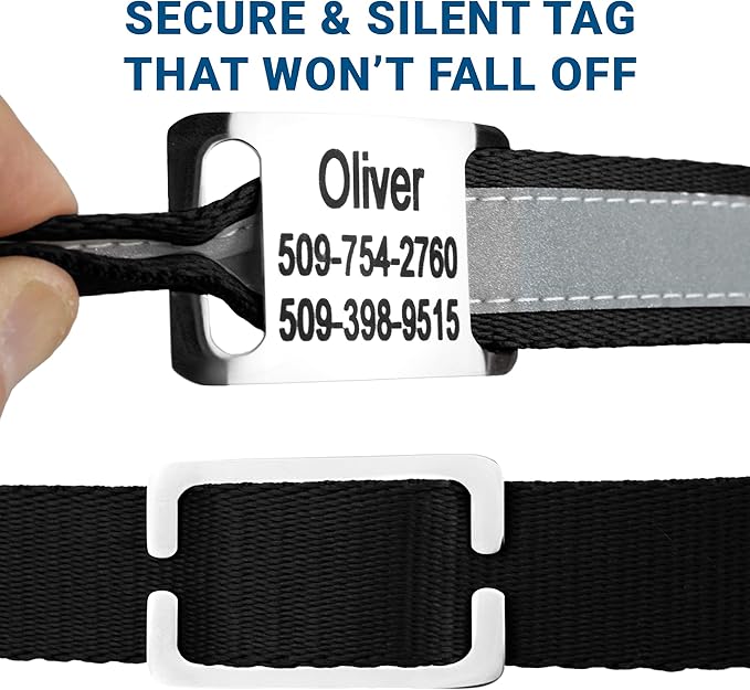 GoTags Reflective Personalized Dog Collar with Nameplate, Adjustable Dog Collar with Custom Engraved Steel Slide On Pet ID Tag, Silent, No Noise Dog Tag for Large Medium or Small (Black, Medium)