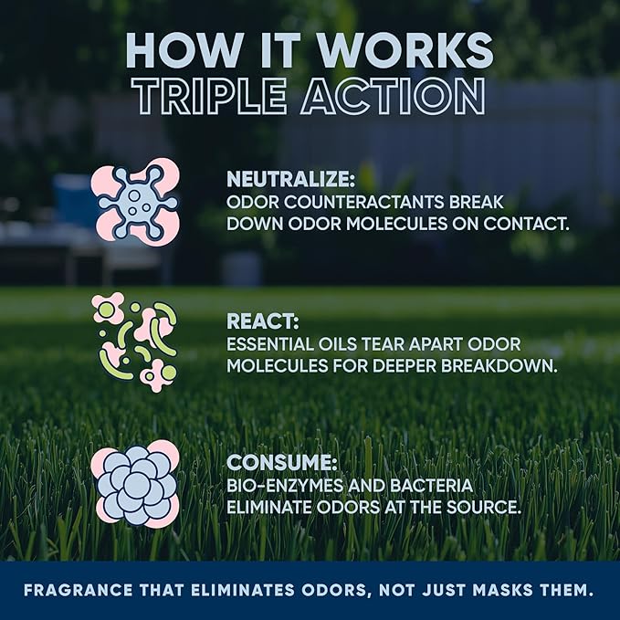 - Powerful & Natural Odor Eraser: This chemical-free formula is a pet poop & pee smell destroyer. Spray it on any outdoor surface, and odors will quickly disappear. The only thing left behind will be a fresh eucalyptus scent.