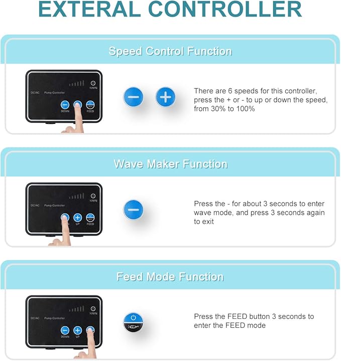 - DC controllable return pump:6 speed adjustable,control the flow from 30% to 100% of max flow,with 10 minutes feeding mode and wave maker function;NOTE:The controller panel is not waterproof, not for outdoor use if without protection or rainproof measures;