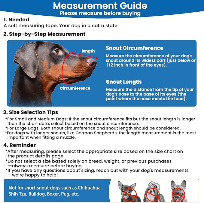 - Large Dog Muzzle: This size 5 (Snout Cir: 12¼“-13¾”) (Snout Length: 4") large muzzle is designed for large dogs. Please measure your dog’s snout circumference at its widest point and the snout length from the tip of the nose to the base of the eyes, just below or about ½" in front of the eyes