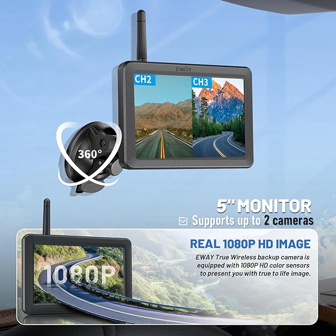 - Two Channels 5" Split Screen: Wireless Battery-powered camera with Split-screen monitor supports 2 video channels, you can add on a second wireless reverse rear view camera to as a side view or front view camera to reduce blind spot for your driving; Also you could used it as a monitoring camera to install inside your vehicle/horse trailer/RV; Bluetooth backup camera supports DIY guidelines, adjust the guide lines according to your needs