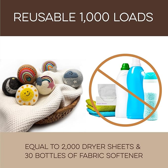- REUSABLE FOR 1000+ LOADS β REDUCE WASTE: Why keep buying disposable dryer sheets? These cute dryer balls last 1000+ loads, replacing 2000 dryer sheets or 30 bottles of fabric softener. Fluff Ewes dryer wool balls laundry reusable deliver a cost-effective solution for 2-4 years of hassle-free laundry. Make a smarter choice for your wallet and the environment.