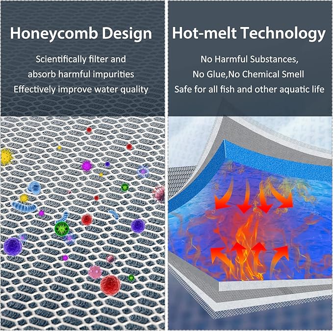 - 【Improve Water Quality】: With Upgraded Honeycomb Shape Design, the filter pads for aquarium have strong water permeability, which can scientifically filter and absorb the harmful bacterial impurities, easily establish nitrification system, stabilize the cultivation of nitrifying bacteria, provide clean water and safe living environment for fish and other aquatic life.
