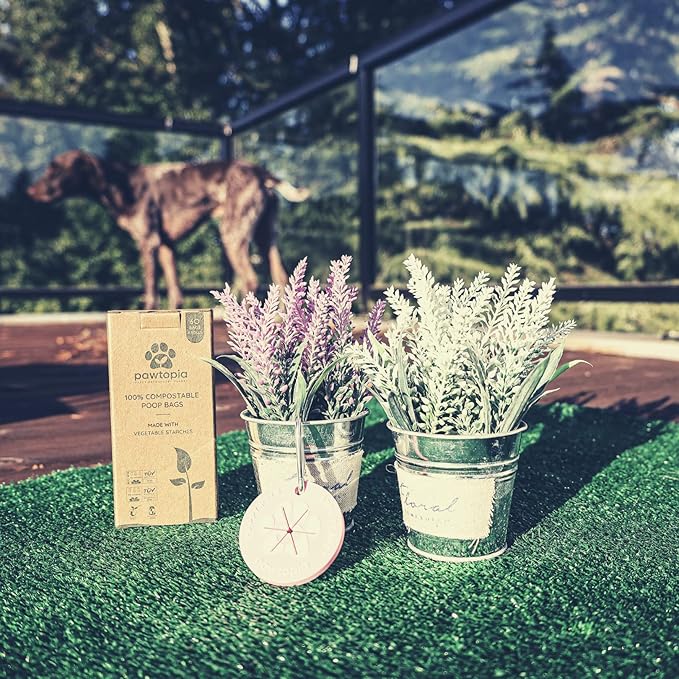 - Purely compostable dog poop bag (60 bags, pink bag carrier): Pawtopia supports sustainable living and does not harm the environment (unlike plastic bags). Our biodegradable dog poop bags, made with vegetable starches (corn starch), are 100% home compostable and break down into natural substances such as water, Co2, and biomass. Our biodegradable poop bags are certified with OK Compost Industrial under EN 13432 (equivalent to ASTM6400), and OK Compost Home by TΓΌv Austria under AS5810/ NF T51800.