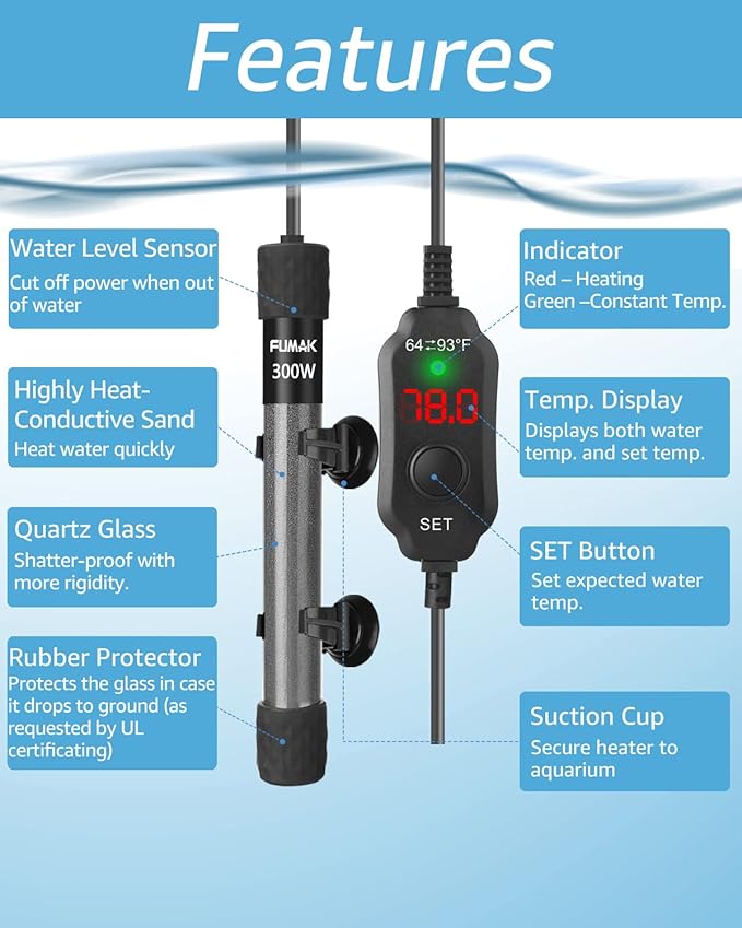 - SUPER MINI SIZE – This aquarium heater is SUPER SHORT in length – might be the shortest heater in the market! It is only a bit more than HALF of the length of the traditional aquarium heaters! The innovative super short length perfectly solves the headache of the fish keepers on the traditional aquarium heaters! Takes up less space, easy to hide, but in full power! Temperature range is 64-93F. 300 Watt for 40-60 Gallon tanks.