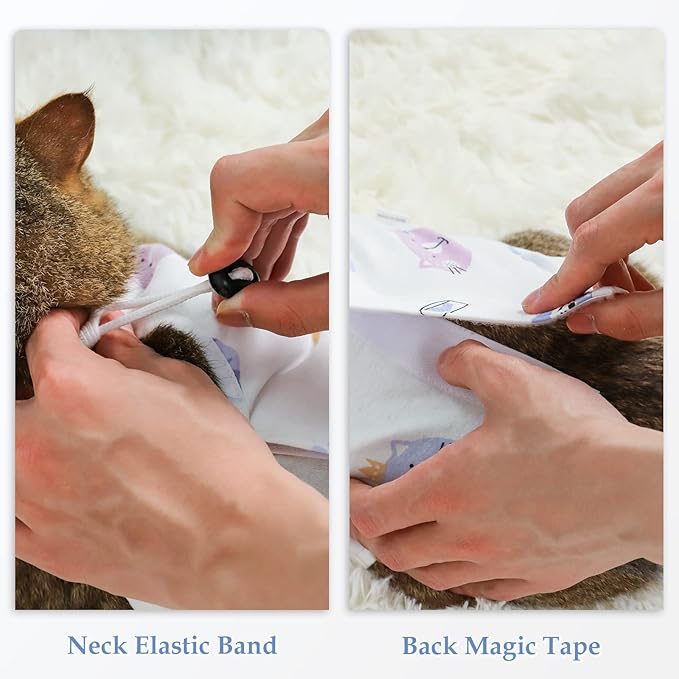 - 【Secure Fit and Easy to Put on】 Our cat surgery suit features adjustable neck elastic band and back velcro tape design, providing a secure and customized fit for your furry friend. Recovery suit for cats after spay can reduce the risk of escape or removal, and allow for easy adjustment to accommodate the cat's size and comfort.