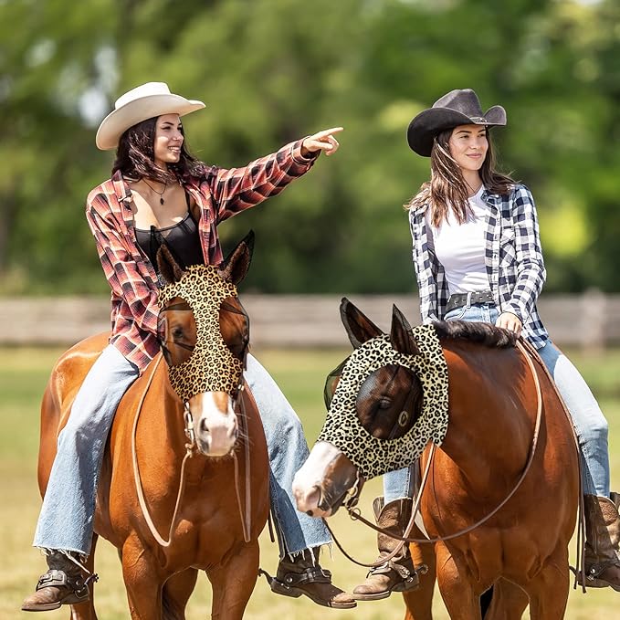 Chunful 6 Pcs Horse Fly Masks with Ears Smooth and Comfortable Cashel Mesh Fly Mask Elasticity Breathability UV Protection Horse Face Covering for Riding Supplies(Leopard,Large)