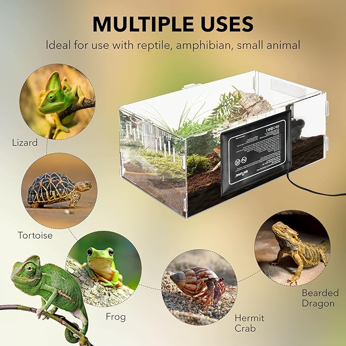 - EASY SETUP: This heat mat for reptiles is suitable for any glass terrarium and all you gotta do is pull it out of the box, pull the adhesive on the back off, and stick it wherever you want. A kindly reminder: Please power on the mat first to make the surface flat so that the 3M sticker can fit better on the surface of the tank.