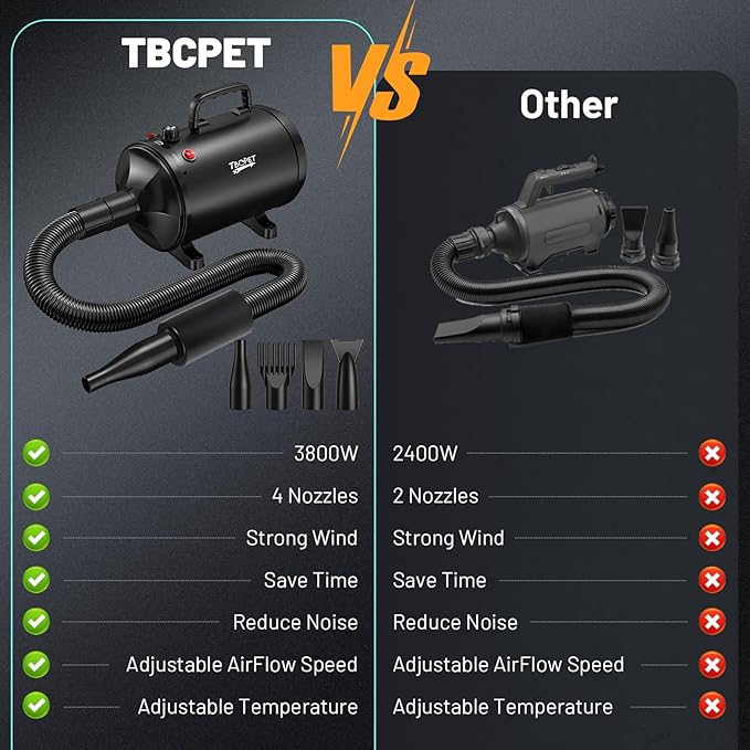 - [Versatile & Stable] Our pet hair dryer is designed for more than just grooming your pets; it is also great for drying your car, floors, and furniture. With a stable motor and adjustable speed and temperature settings, it offers ease of use and consistent performance.