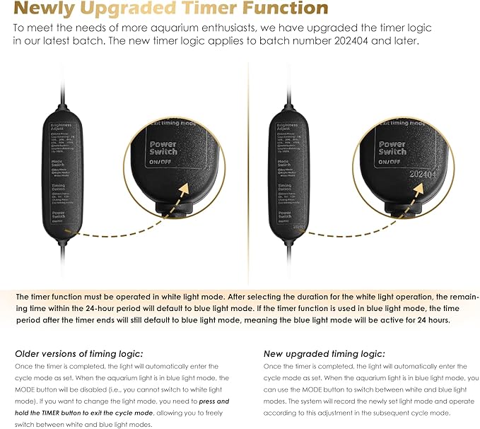 - Timer and Memory Function: The aquarium light offers three timer options, allowing you to select different durations and simulate sunrise and sunset for a more realistic day-night transition. The power outage memory function ensures that your settings remain unchanged when the power is turned off/on. Even after a power outage, your timer settings are retained, saving you the hassle of resetting them repeatedly.
