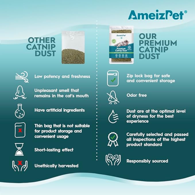 - MAKE PLAYTIME EXCITING AGAIN. Inject a burst of excitement into your cat's play sessions with the exceptional cat nip dust. The finely powdered texture of cat grass ensures a potent release of fragrance, reviving your cat's playful spirit. Sprinkle the cat nip dust on their toys, scratching surfaces, or even create a cat nip trail for a thrilling treasure hunt experience. Let the joy of playtime reach new heights with our irresistible catnip treats.