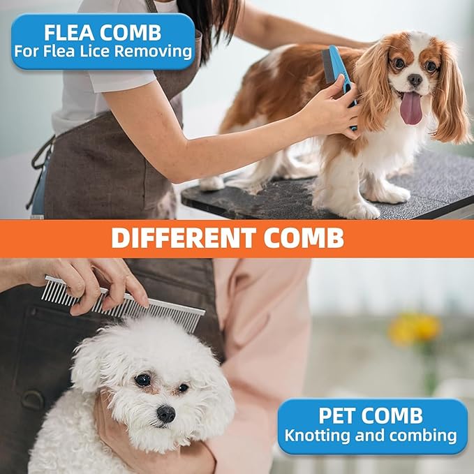 - A variety of different de-shedding tools:1. dog cat self-cleaning grooming brush can easily for pets shedding effortless; 2. double-sided de-shedding rake to remove the undercoat of the dog and cat, to reduce hair loss; 3. bathing brush to thoroughly clean and massage every inch of the pet's hair ;4. coarse and fine tooth row comb for pet grooming styling, to remove the undercoat knotted tangled ;5. flea comb to remove fleas