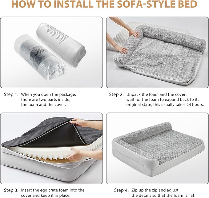 • ORTHOPEDIC FOAM DOG BED: This dog couch is made of orthopedic egg foam, the thick dog bed helps cushion pressure points, and supports the dog's joints and muscles evenly. Therefore the orthopedic dog beds can ease the discomfort of anxious older dogs, and dogs with arthritis and promote better sleep at night.