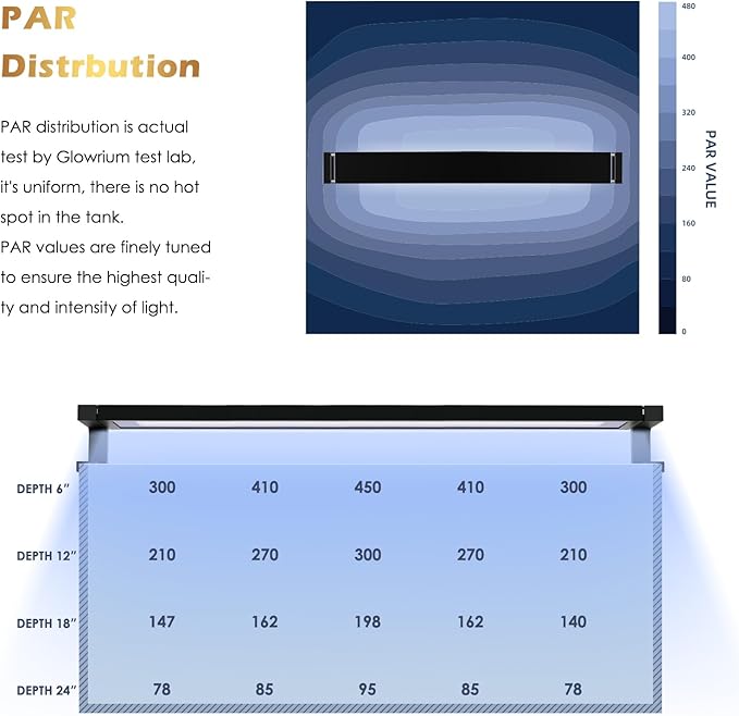 - 【Saltwater Aquarium Light】Suitable for LPS corals, SPS corals, this six-channel full-spectrum design simulates coral growth lighting in the ocean. It includes Cool White 6500K +10000K,Cyan 480nm,Blue 460nm+440nm ,Violet 420nm,UVA 395nm,Red 660nm.