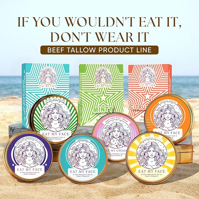 - BEEF TALLOW SUNSCREEN SUITABLE FOR THE WHOLE FAMILY: Eat My Face sunscreen is a zinc tallow sunscreen that is gentle yet effective biodegradable sunscreen reef safe for everyone, from babies to adults. All natural sunscreen without chemicals, this animal based sunscreen is made with food-grade ingredients, a reef safe sunscreen spf 30 with a beef tallow mineral. Eat My Face tallow based mineral sunscreen ensures even sensitive skin remains protected and moisturized without irritation.