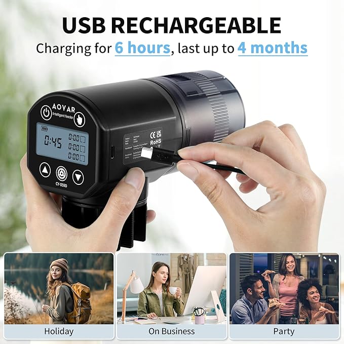- 【USB Rechargeable】Auto fish feeder is powered by USB cable,say goodbye to the trouble of "replacing battery".According to the number of feedings set,it can be used for 3-4 months once charge.Perfect fit for your vacation/weekends/Working.