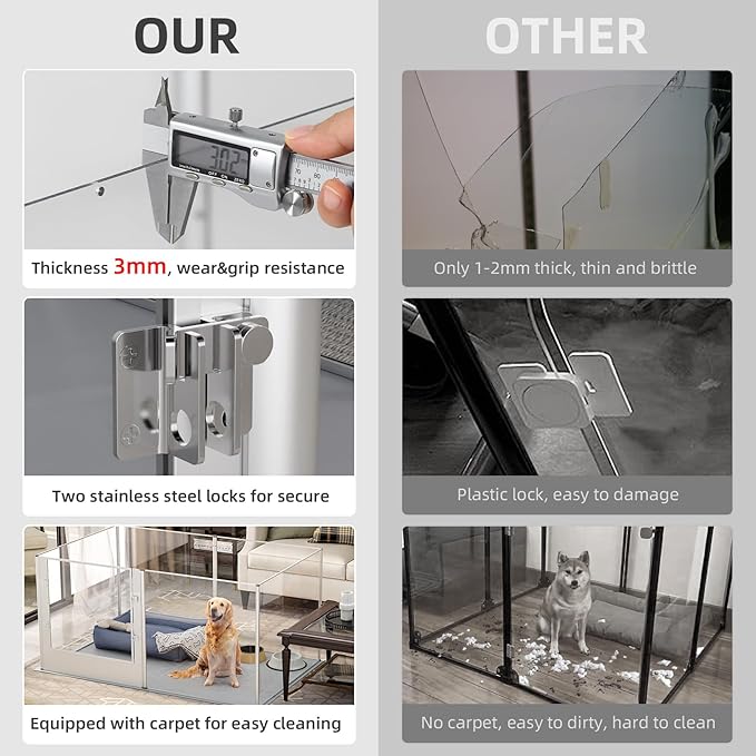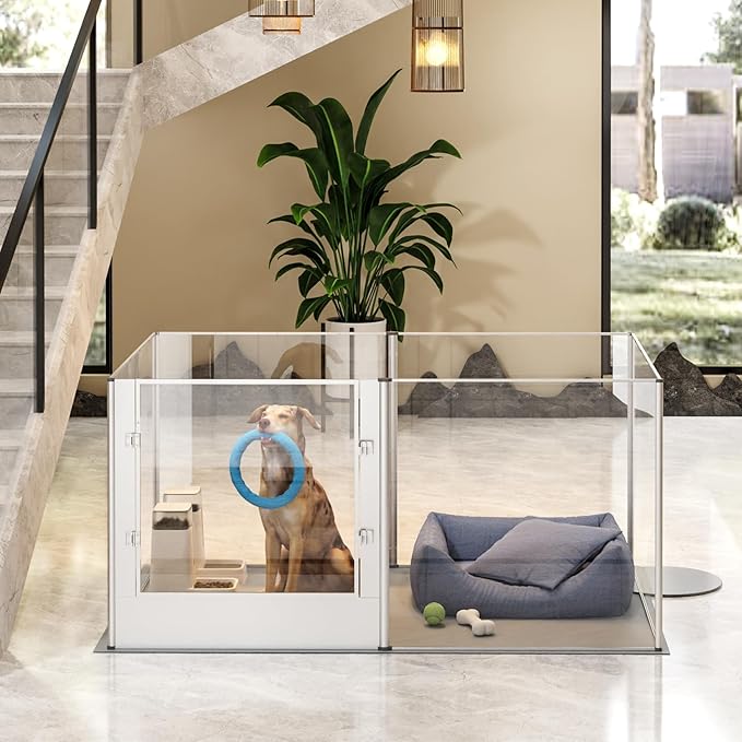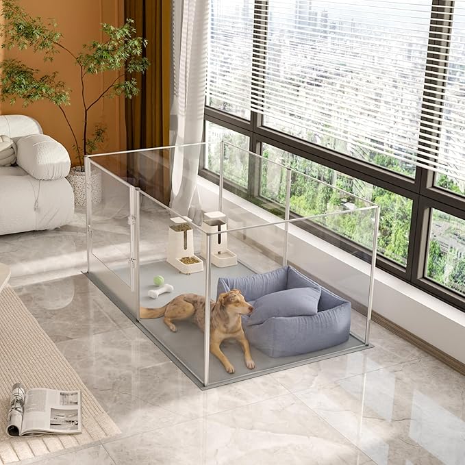 - Clear Acrylic Fence Design - Crystal-clear acrylic dog fence playpen enables you can interact with your pets closely, 360Β° high transparency and wide vision, itβll relieve your pets from anxiety, they also make sure you are by their side, equipped with a door for dog mom/ pets to come and go easily, so this is a unique gift for your loved friends, get this fence in the room, instantly improve the overall interiors