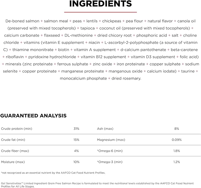 - LIMITED INGREDIENTS FOR SENSITIVE CATS: Go! Solutions Sensitivities recipes are thoughtfully crafted for cats with sensitive stomachs and food allergies using minimal ingredients while meeting nutritional needs