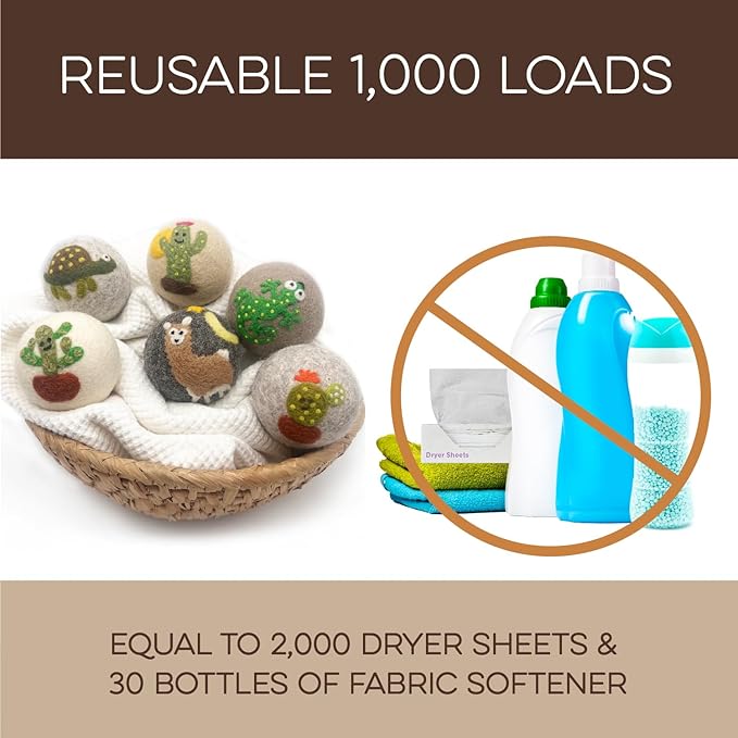 - REUSABLE FOR 1000+ LOADS β REDUCE WASTE: Why keep buying disposable dryer sheets? These cute dryer balls last 1000+ loads, replacing 2000 dryer sheets or 30 bottles of fabric softener. Fluff Ewes dryer wool balls laundry reusable deliver a cost-effective solution for 2-4 years of hassle-free laundry. Make a smarter choice for your wallet and the environment.