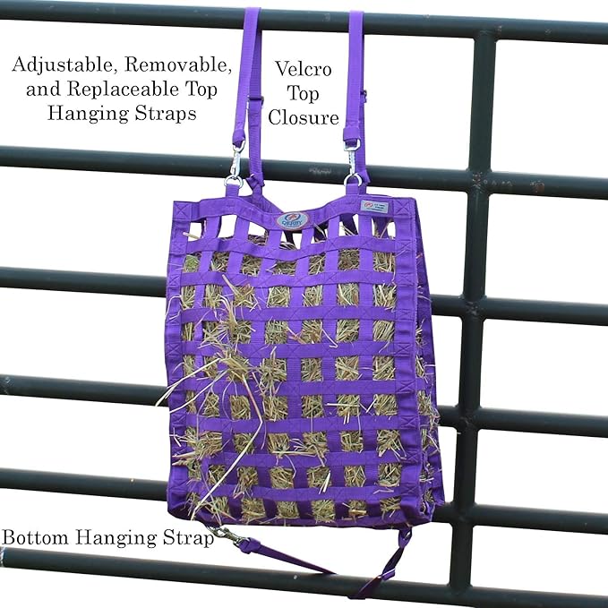 - SUPER TOUGH BOTTOM DESIGN - our exclusive Super Tough Bottom is made of reinforced overlapping nylon webbing. This design allows for superior strength and durability while keeping your hay fresh and allowing dust and debris to exit the bag.