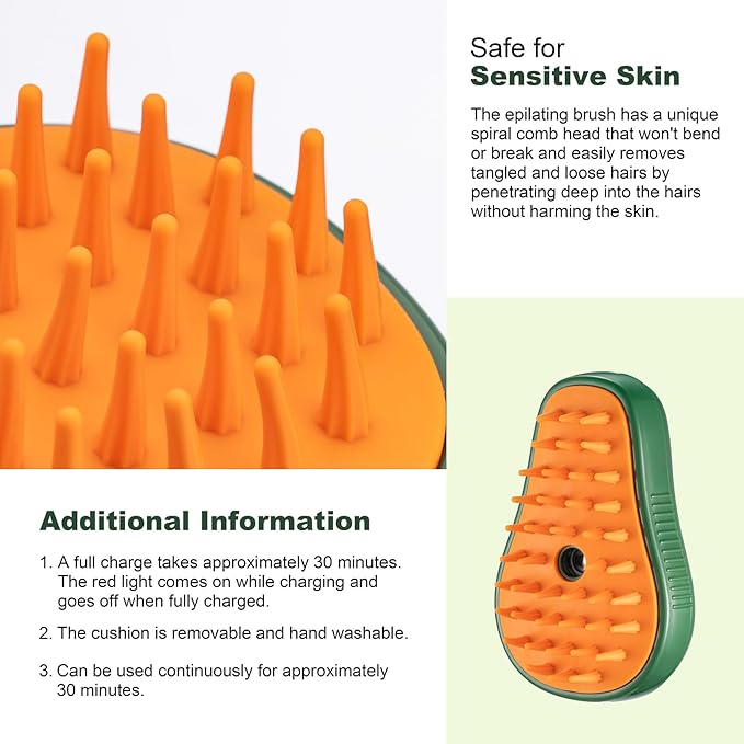 - Tips: Please use a 5V output power charging head to charge this cat steam brush for better performance and stability of the product. Cleaning the cat hair in time to prevent it from blocking the water outlet and affecting its use. If you are not 100% satisfied, contact us directly and we will provide you with a No-Questions-Asked replacement or refund