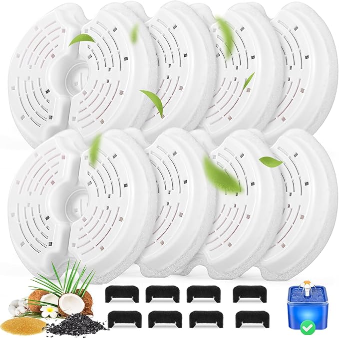 Cat Water Fountain Filters for 84oz/2.5L Stainless Steel Pet Fountain and 67oz/2.0L Plastic Cat Drinking Fountain, 8 Pack Pet Replacement Filters with 8 Pre-Filter Sponges