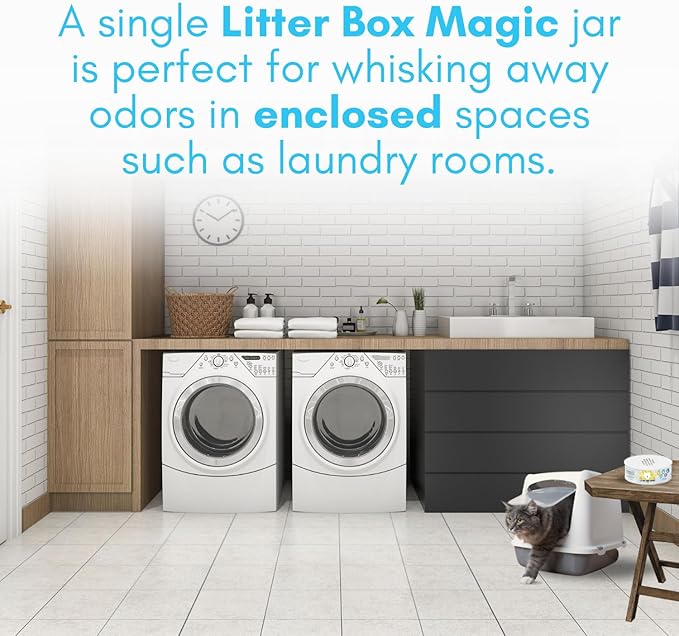 - KEEP LITTER BOX ODORS UNDER CONTROL β Our cat box deodorizer pro-grade strength formula is designed for litter box odor control, lasting up to 30 days. Simply twist open the jar and let it do its jobβideal for bathrooms, closets, enclosed basements, and small, poorly ventilated areas. Its continuous odor-inhibiting properties can help with intense cat smells for 30 days.