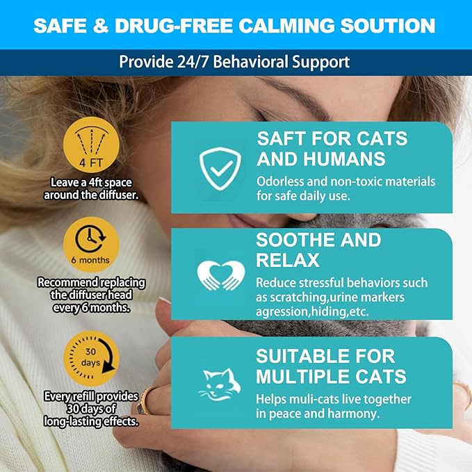 - Cat Calming Diffuser: This cat pheromones diffuser kit use newly upgraded diffusion technology to bring effective calming pheromones to cats and relieve stress. This is a simple and effective cat pheromone solution to make your cat happier and more relaxed