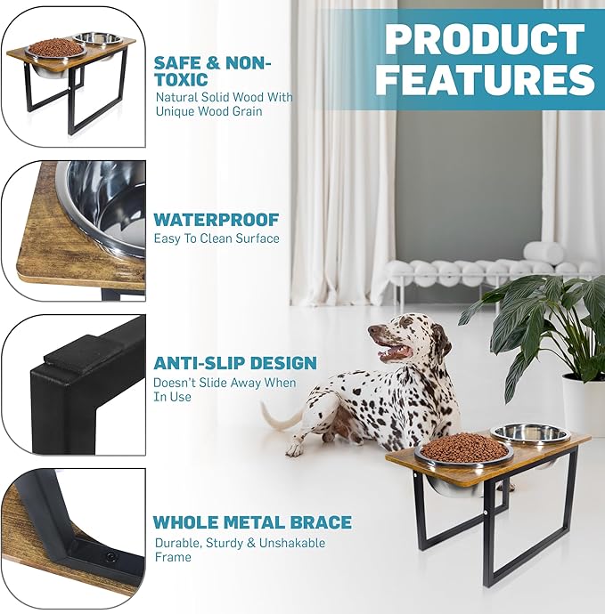 - STURDY CONSTRUCTION - This raised dog bowl stand is built to last, with a sturdy construction of the non-slip iron base and water-proof wooden countertop that can withstand daily use from even the most energetic pets. The iron base of our raised dog feeder provides stability and prevents the stand from sliding around during meal times, keeping your floors clean and mess-free.