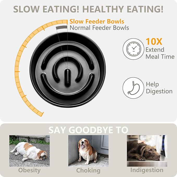 - 【Slow Eater Bowl】Change your dog's fast and excessive eating behavior — Pets that eat quickly tend to get fat and choke, which can make the dog sick. Our innovative slow feeder dog bowl is meticulously crafted to encourage your dog to eat at a slower pace, extending mealtime by 10 times.
