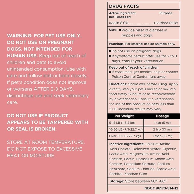 - This 12 oz. anti-diarrhea liquid for dogs is good for all breed sizes. Made in the USA.