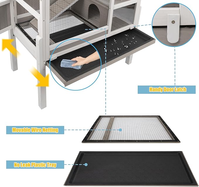 - 🐹【Easy Clean with Bottom Tray】Our hamster cages large are upgraded with a 2” Deeper plastic tray which is sturdy and durable enough to hold more shavings. A removable tray with a leak-proof can be simply pulled out to clean the litter or bedding, with two wooden locks to prevent the tray from sliding out.