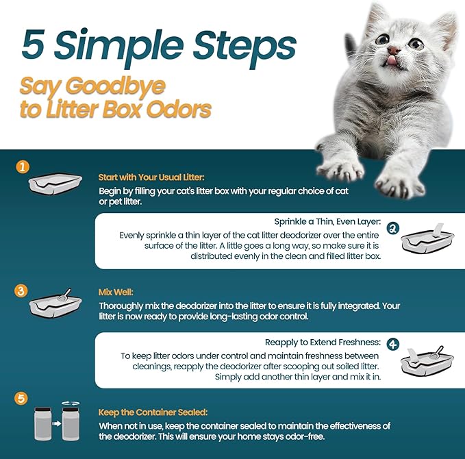 - 【Easy to Use】In a clean cat litter box, mix the activated carbon evenly into the cat litter. During daily cleaning, remove feces and coagulated urine in time, which helps to keep the cat litter box clean. The activated carbon is evenly distributed, which makes its deodorizing effect last longer. Provide a fresher and more comfortable toilet space for your pet.