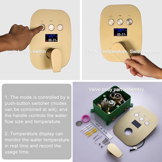 - Temperature digital display(no power or battery required): rain shower system design update, shower valve uses a hydro generator, built-in LCD digital temperature display(Β°F), easy to monitor temperature