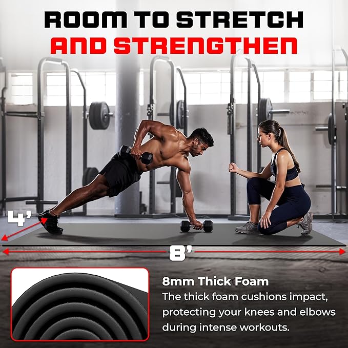 - EXPAND YOUR FITNESS SPACE using our extra wide workout mat. Whether you're into yoga, bodybuilding, or cardio, these exercise mats provide ample room for full-body movements. It's also great for kids' playrooms, offering a soft surface for their activities and for mechanics working under vehicles on hard surfaces