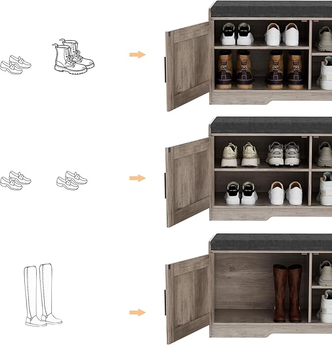 - Keep Your Shoes Organized: The depth of bench is 13.8 inches, which makes it easily to put in your shoes, meanwhile shoes of various heights can be placed by adjusting middle movable boards. The bench doors design ensures not only your privacy, but also a tidy space