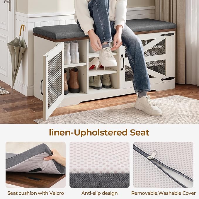 Farmhouse Storage Bench with Cushion, Metal and Wood Shoe Rack Organizer, Adjustable Shelf, Shoe Cabinet with Half Hidden Storage Space, for Entryway, Bedroom, Living Room (Old White, 43.3in)