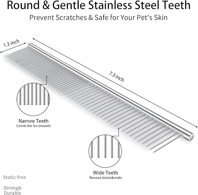 - Complete 5 PCS Grooming Kit: This set has all you need for grooming. The stainless steel comb detangles, the flea comb removes fleas and eggs, the rubber bath brush massages and cleans, and the undercoat rake removes mats and loose fur, keeping your pet’s coat healthy and shiny.