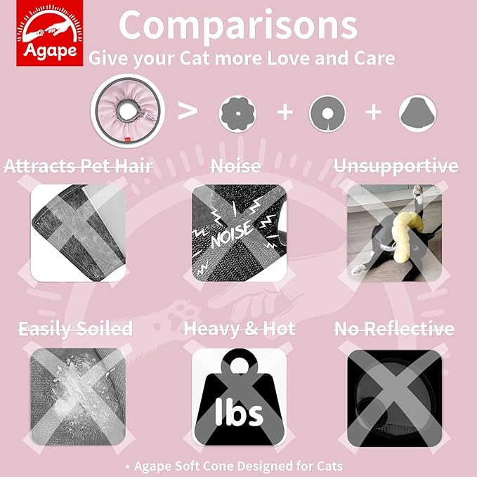 - 【Soft & Lightweight】Unlike bulky, uncomfortable cones on the market, Agape's cat cone is made with two layers of silky fabric and a ribbed knit collar, weighing just 1.2 ounces—about the same as two single AA battery. This ultra-light, breathable, and soft design ensures your cat can sleep peacefully and comfortably, without feeling any strain or restriction around their neck