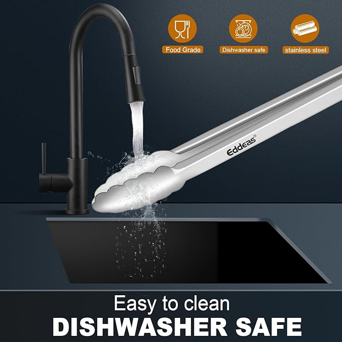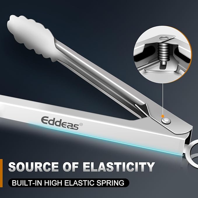 - FOOD-GRADE STAINLESS STEEL - EDDEAS kitchen tongs are made of 1mm thick food-grade stainless steel in one piece for enhanced robustness and heat resistance, rust resistance and easy handling. Tongs for cooking the overall light weight and ergonomic features are maintained.