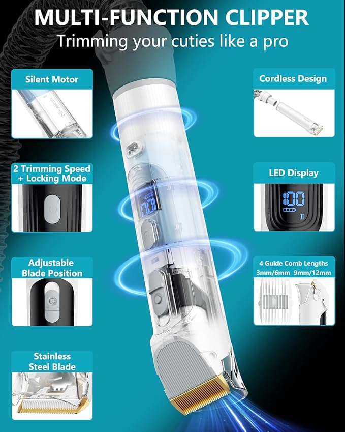 - ๐ฉใVersatile Clipper & 2L Large CapacityใThis professional dog clipper for grooming features 7 cutting lengths and 2 speeds to trim your pets to any desired haircut. The LED display and detachable design enhance the ease of use and versatility of the trimmer. The dog vacuum has a 2L large dust box so you don't need to empty it frequently even if you are trimming a large & long-haird dog.